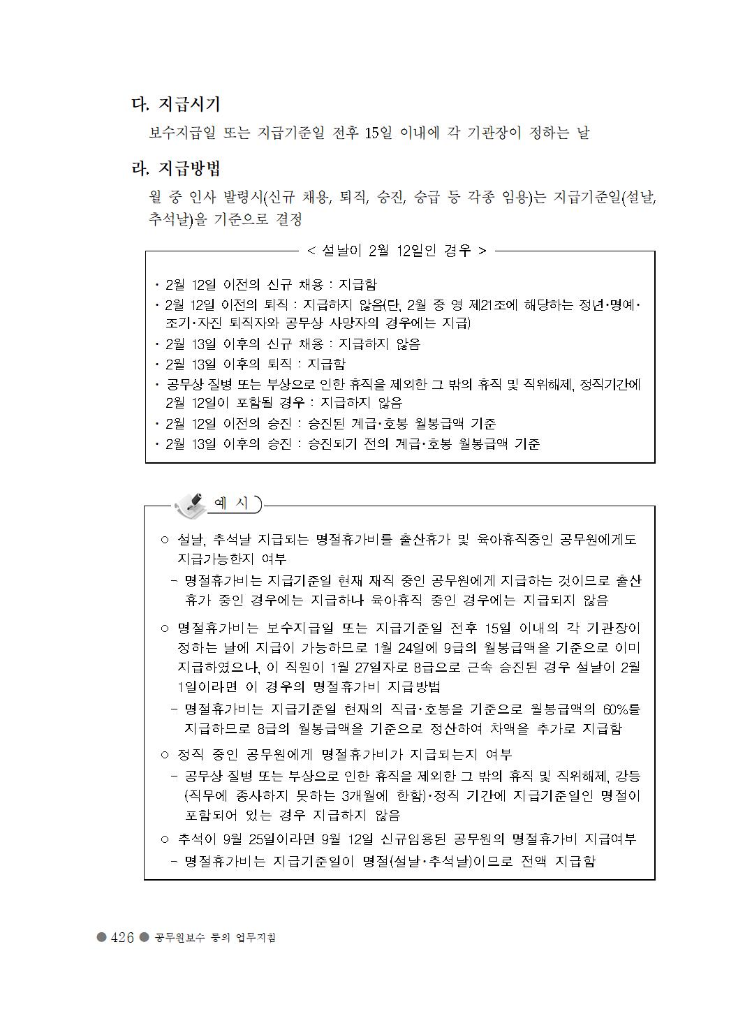 ※ 월 중 인사 발령시(신규 채용, 퇴직, 승진, 승급 등 각종 임용)는 지급기준일(설날, 추석날)을 기준으로 결정<출처 : 공무원보수 등의 업무지침 [시행 2022. 7. 22.] [인사혁신처예규 제135호, 2022. 7. 22., 일부개정]>