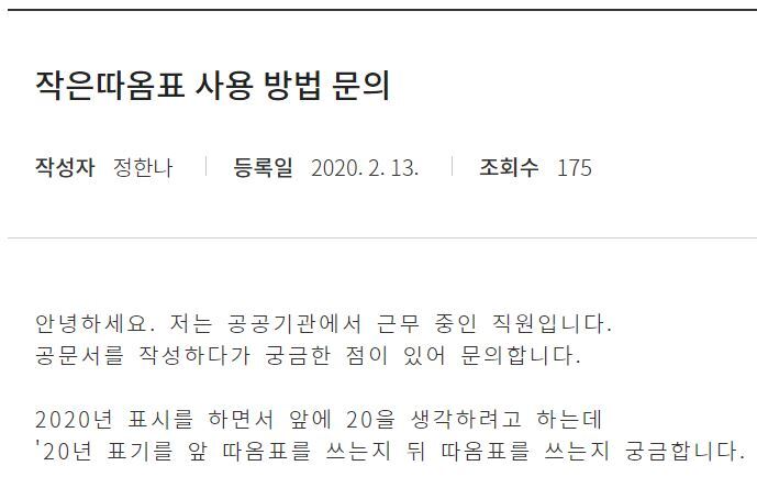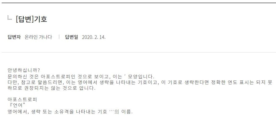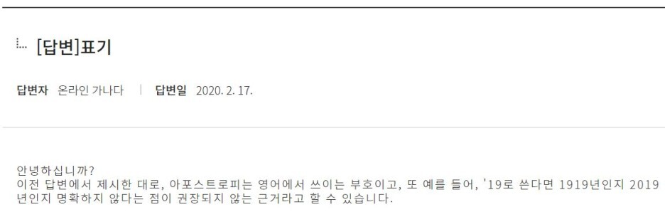 실무적으로 굳이 쓴다면 아포스트로피(’)를 쓴다.: ’20.(△)가. (첫 번째 이유) 아포스트로피(’)는 영어에서 생략 또는 소유격을 나타내는 기호이다.