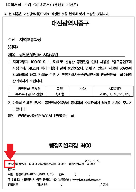 실무에서 예전 기안문을 재작성하거나 다른부서나 기관에서 수신한 공문을 보다 보면, 시행문 하단 담당자 이름 앞에 별표(★) 표시가 있는 것을 종종 보곤 합니다. 이름 앞에 별표가 붙어 있으니깐 담당자의 이름이 더 눈에 띄기도 합니다.