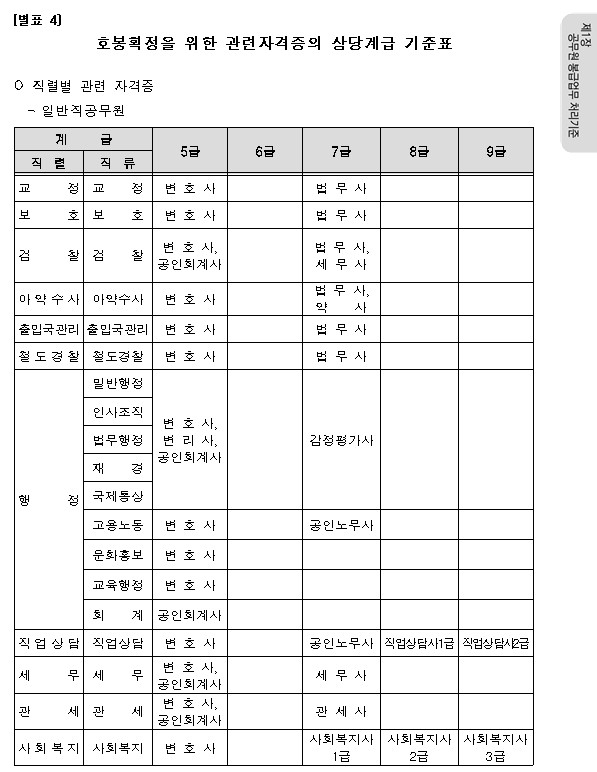 - 임용되는 직종과 계급체계가 다른 공무원경력 또는 유사경력의 경우에는 이 장 별표 2 내지 별표 4의 호봉획정을 위한 상당계급기준표 등에 의한다3. [별표 4] 호봉획정을 위한 관련자격증의 상당계급 기준표 / 일반직공무원 / 직렬별 관련 자격증