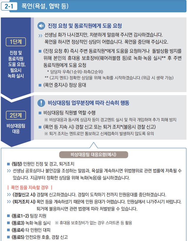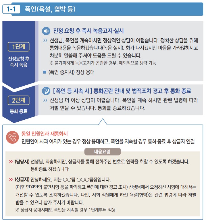 특이(악성)민원 대응 유의사항 / 출처: 행정안전부 공직자 민원응대 매뉴얼 개정판(2022) 2. 전화 민원응대(폭언 욕설 협박 등) : 진정 요청 후, "즉시 녹음" → 폭언 지속 시 법적 조치 경고 후, "통화 종료"