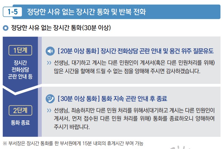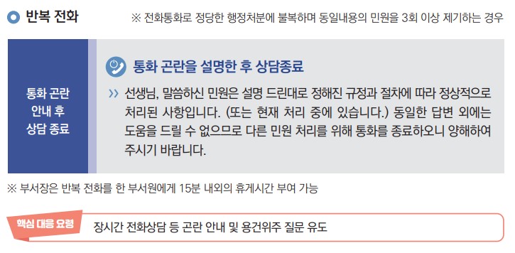특이(악성)민원 전화대응(상급자 통화요구) 매뉴얼 / 출처: 행정안전부 공직자 민원응대 매뉴얼 개정판(2022) 4. 전화 민원 대응(장시간 또는 반복 통화) : 20분 이상 통화 시, 장시간 상담곤란 안내 → 30분 이상 통화시, 통화 종료