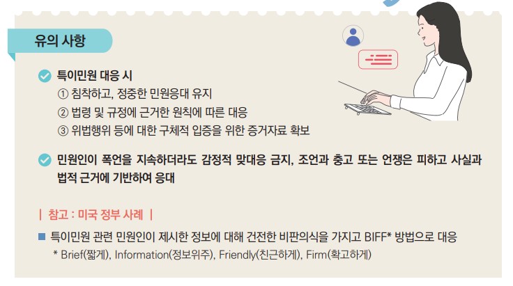 공직자 민원응대 매뉴얼(개정) (1).pdf3.76MB1. 특이민원 대응 방향 : 일반적인 민원응대와 특이민원은 분리하여 대응, 녹음 녹화 등 근거자료를 바탕으로 기관 차원 법적 대응