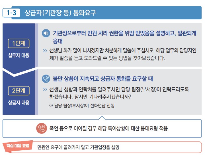 특이(악성)민원 전화대응(폭언, 욕설, 협박) 매뉴얼 / 출처: 행정안전부 공직자 민원응대 매뉴얼 개정판(2022) 3. 전화 민원 대응(상급자 통화 요구) : 업무처리 권한 위임을 근거로, "실무자 대응" → 불만 지속 시, "상급자 대응"